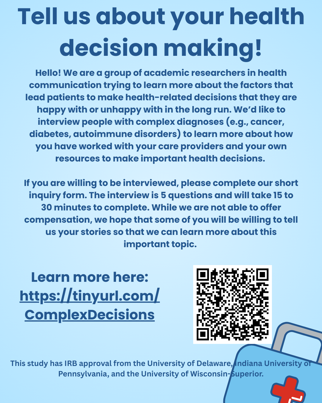 In our current study, we are trying to learn more about the factors that lead patients to make health-related decisions that they are happy with or unhappy with in the long run. We’d like to interview people with complex diseases (eg cancer, diabetes, autoimmune disorders) to learn more about how they have worked with their care providers and their own resources to make important health decisions. If you are willing to be interviewed, please reach fill out our very brief form to schedule a time to talk. The interview is 5 questions and will take 15 to 30 minutes to complete. While we are not able to offer compensation, we hope that some of you will be willing to tell us your stories so that we can learn more about this important topic. THANK YOU!!!